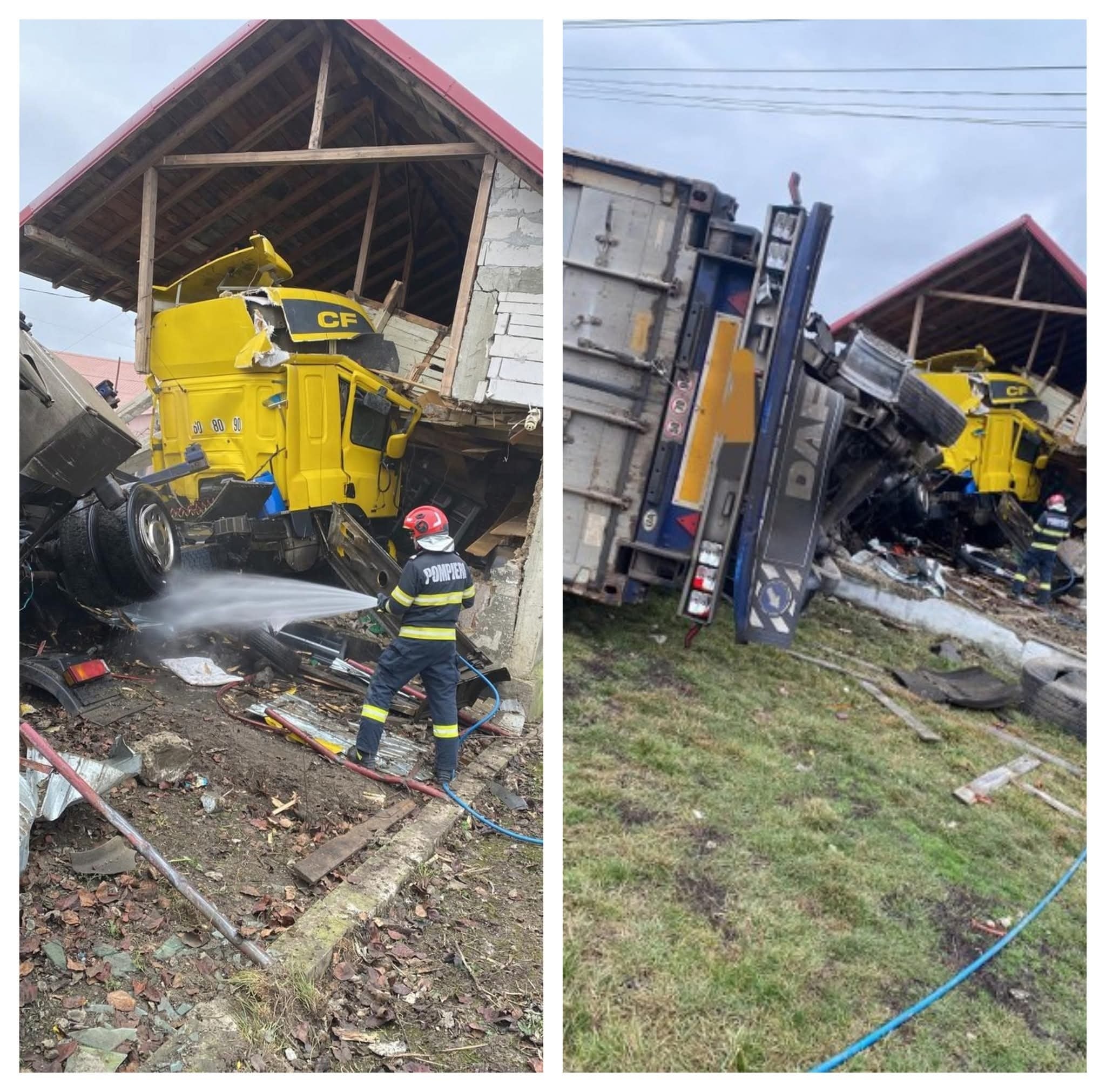 Un autotren a intrat direct într-o locuință, provocând pagube semnificative structurii casei. Din fericire, șoferul camionului a reușit să se autoevacueze, iar nicio persoană nu era prezentă în casă în momentul impactului