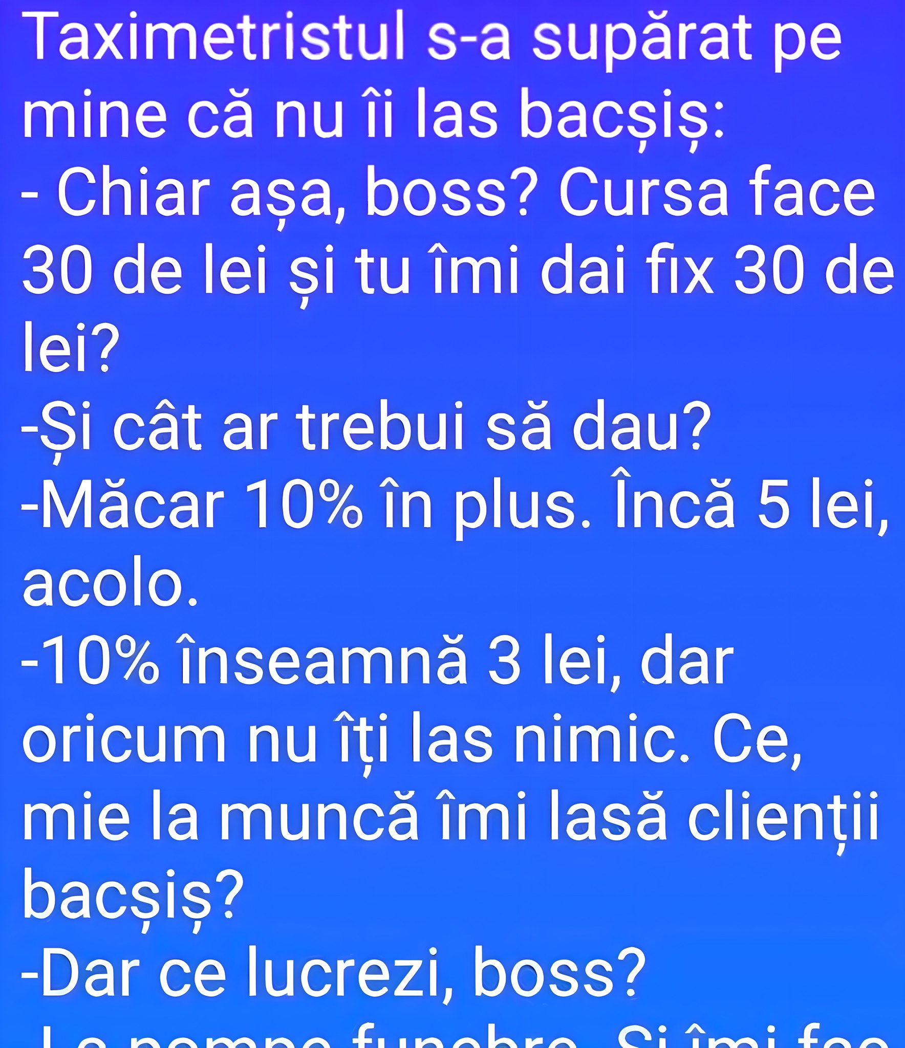 Conversația care te va face să râzi garantat. Cum i-a raspuns acest tânăr unei femei Taximetristul s-a supărat pe mine că nu îi las bacșiș:-Chiar așa, boss? Cursa face 30 de lei și tu îmi dai fix 30 de lei?-Și cât ar trebui să dau? -Măcar 10% în plus. Încă 5 lei, acolo.-10% înseamnă 3 … Citește mai mult